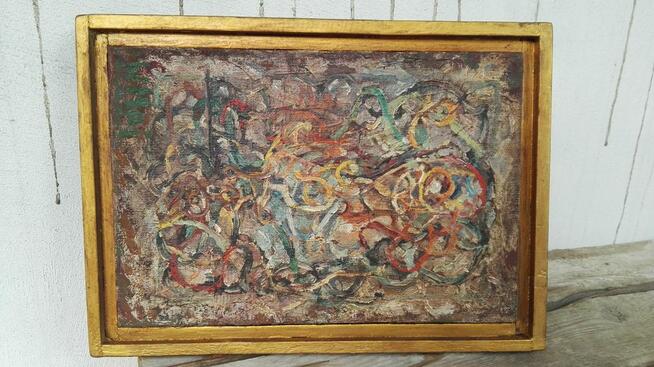 Obraz olejny w drewnianej pomalowanej na złoto ramie .Ciekawy surrealistyczny , w dobrym stanie.