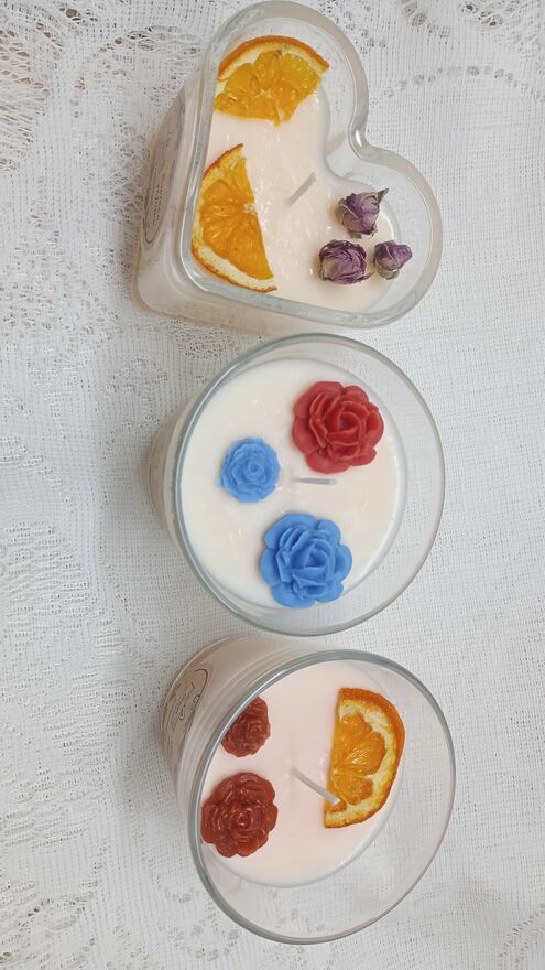 Oferuję piękne, ręcznie wykonane świece sojowe w szklanych pojemnikach.Kazda świeca jest unikalna i tworzona z dbałością o detale, zdobiona suszonymi kwiatami, owocami, cynamonem i elementami woskowymi.Wosk sojowy , różne zapachy, ręczna produkcja,idealne na prezent, upominek i wystrój wnętrz. Możliwość wysyłki ,tel 534 - pokaż numer telefonu - .Dostępne 100 ml,200ml.Monika