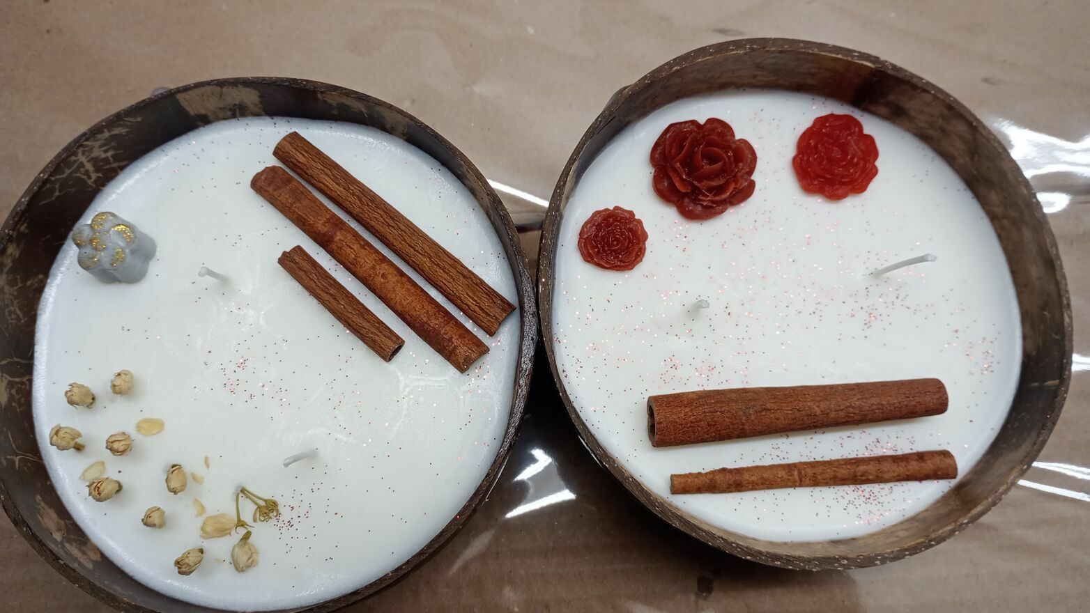 Świece sojowe handmade w misce kokosowej.